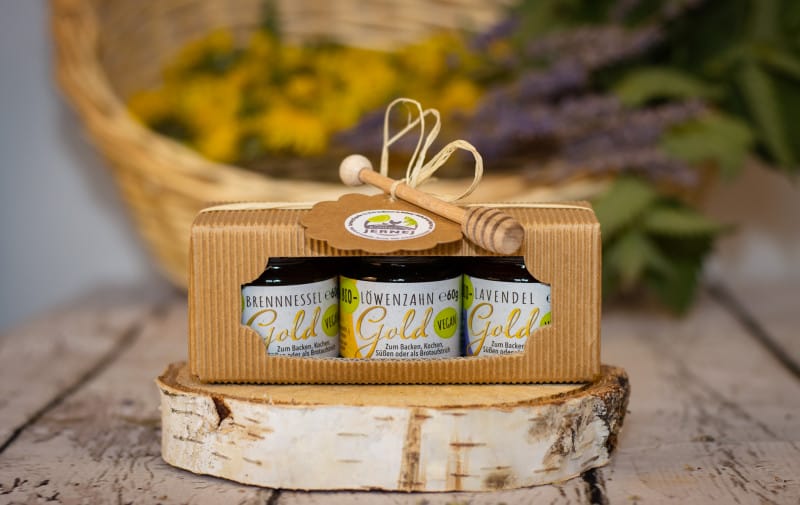 Den Duft von Lavendel kennt jeder. Gleich denkt man dabei an wohlriechendes, lila Lavendelfeld in der Provence. Aber dieser Lavendel stammt von unserem eigenem kleinen Lavendelfeld aus dem Süden Kärntens, aus Tscherberg unter dem Katharinakogel.Der Lavendel wird in liebevoller Handarbeit gesammelt und schonend getrocknet, damit er dann zu Lavendel-Gold verarbeitet wird.Das Lavendel-Gold besticht mit seiner lila-rötlichen Farbe und dem leicht herb-bitterem Geschmack. Beim Öffnen des Glases strömt einem ein eindeutiger Lavendelduft entgegen.Passt gut zu Dessert, Eis, Süßspeisen.